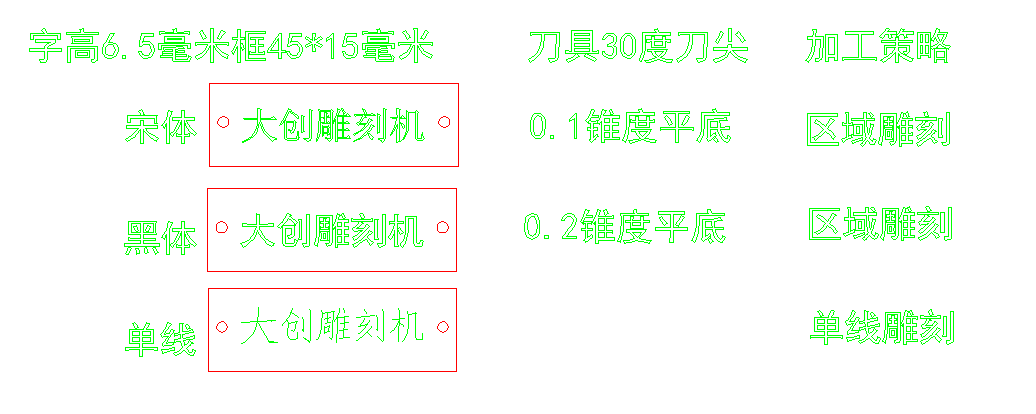 双色板标牌加工是雕刻机应用的一种,首先在设备操作上,一定要把台面洗平,因为双色板的表面雕刻深度是一般0.1毫米左右,双色板雕刻机幅面一般是在60X90的幅面,当然通常不会一次雕刻这么大,台面的高度误差虽然允许存在,但不可以太大,雕刻机台面洗过后通常不会有太大问题。双色板背面一般用美文纸贴上,然后再在美纹纸的背面贴上双面胶,这样当刻完后,标牌背后的美纹纸容易揭掉,把双色板粘到台面上后,用手掌均匀压平。然后准备文件,标牌加工现在用精雕软件,也有用文泰,下面是精雕加工黑体标牌的案例和策略。黑体笔画均匀,用0.2的刀,上面的宋体同样策略只能用0.1的刀。单线体比较简单。
